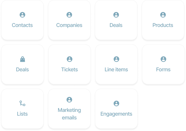 Contacts, lists, workflows, forms, email data and more.